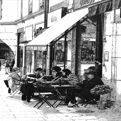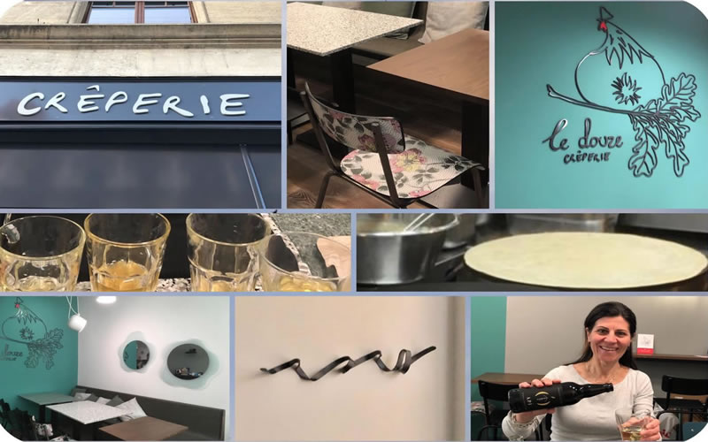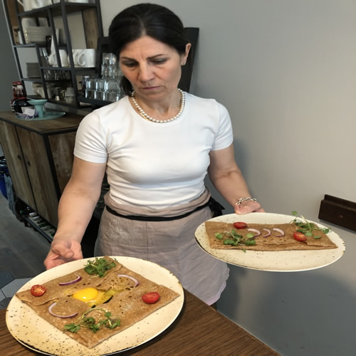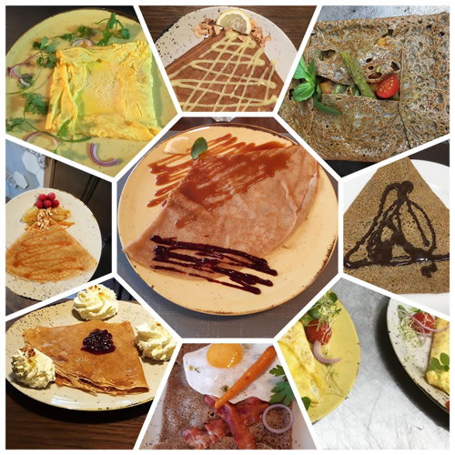 ☻ tout au long de la journée, des Crêpes salées, au sarrasin (sans gluten), des Crêpes sucrées, des Omelettes ainsi que des Salades.